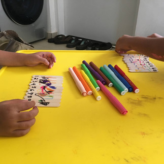 The next activity I had was with markers instead of paint, although it ended up being just as messy. The girls each made their own puzzles out of popsicle sticks. I lined up ten popsicle sticks and then taped them together. The girls then drew whatever they wanted on their popsicle sticks and once I took the tape off, I labeled them from 1 to 10. So now they have their very own puzzles that they created themselves!
